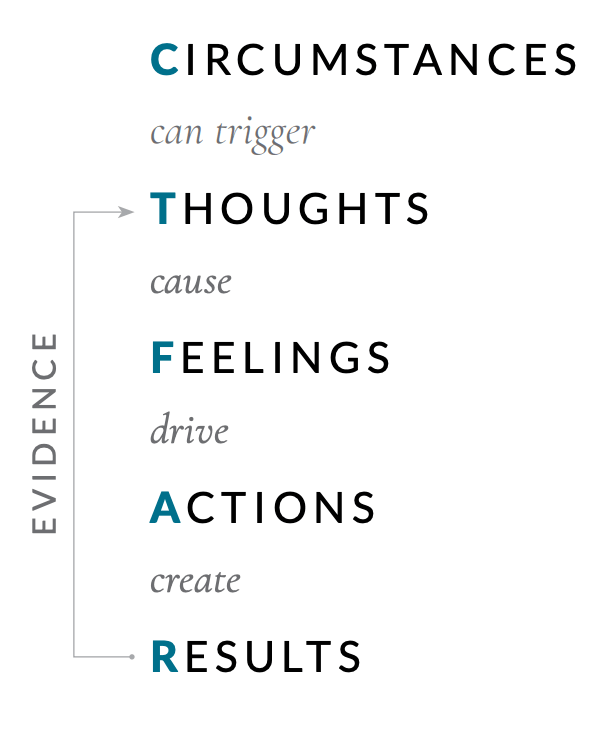 Everything we encounter in our lives can be categorized and broken down into the CFTAR (Circumstances, Thoughts, Feelings, Actions, and Results) model created by Brooke Castillo.